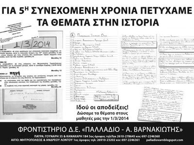 Για 5η χρονιά, το φροντιστήριο "Παλλάδιο-Α.Βαρνακιώτης" συνέχισε την παράδοση να πιάνει τα θέματα στην Ιστορία Κατεύθυνσης. Μάλιστα, τα θέματα τα είχε προβλέψει και επισημάνει στους μαθητές του από την 1η Μαρτίου 2014!