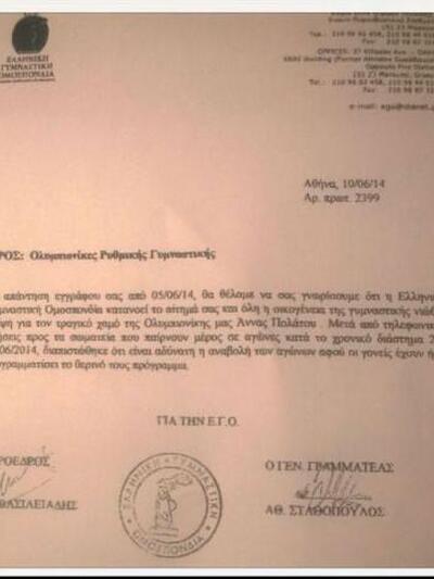 Η απάντηση στο αίτημα των κοριτσιών του ανσάμπλ ήρθε από την Ελληνική Γυμναστική Ομοσπονδία μέσω ενός εγγράφου που ανέφερε: «μετά από τηλεφωνικές κλήσεις προς τα σωματεία που παίρνουν μέρος σε αγώνες στις 21 και 22 Ιουνίου διαπιστώθηκε πως είναι αδύνατη η αναβολή των αγώνων, αφού οι γονείς έχουν ήδη προγραμματίσει το θερινό τους πρόγραμμα».