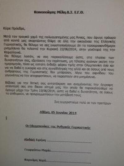 Στις 22 Ιουνίου συμπληρώνονται 40 ημέρες από τον άδικο χαμό της αθλήτριας και οι συναθλήτριές της ζήτησαν από τον πρόεδρο της Ε.Γ.Ο να μην τελεστούν αγώνες εκείνο το χρονικό διάστημα, προκειμένου να καταφέρουν να παραστούν στο μνημόσυνο.