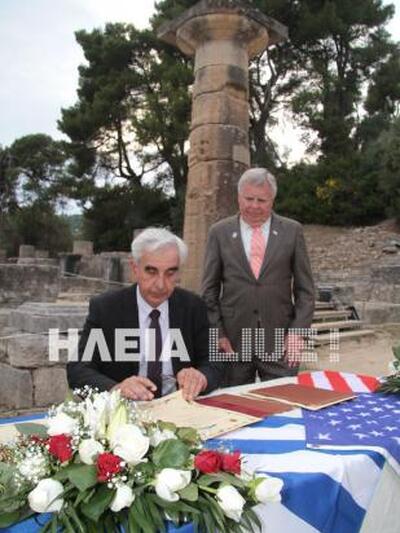 Με μια λιτή τελετή όπως αρμόζει άλλωστε στο αθάνατο ολυμπιακό πνεύμα, μπροστά από το ναό της Ήρας στο Ιερό της Ολυμπίας, επισφραγίστηκε η αδελφοποίηση του δήμου της Αρχαίας Ολυμπίας με αυτόν του Colorado Springs, «πρωτεύουσας» της Εθνικής Ολυμπιακής Επιτροπής των ΗΠΑ. Το απόγευμα της Τρίτης, παρουσία των εκπροσώπων των δύο δήμων, αλλά και του προέδρου της ΕΘΝΟΑ και της ΔΟΑ Ισίδωρου Κούβελου και της συζύγου του πρώην υπουργού και βουλευτή Ντόρας Μπακογιάννη, του βουλευτή Ηλείας Ανδρέα Μαρίνου, του περιφερειάρχη Δυτικής Ελλάδας Απόστολου Κατσιφάρα, του αντιπεριφερειάρχη Ηλείας Χαράλαμπου Καφύρα και άλλων εκπροσώπων θεσμικών φορέων και της ΔΟΑ, πραγματοποιήθηκε η τελετή.