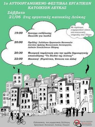 O Εκπολιτιστικός & Μορφωτικός Σύλλογος Εργατικών Κατοικιών Λεύκας Πατρών και το Δίκτυο Δράσης Κοινωνικών Λειτουργών, διοργανώνουν το 1ο Αυτό-οργανωμένο Φεστιβάλ Εργατικών Κατοικιών Λεύκας Πατρών, το Σάββατο 21 Ιουνίου 2014 στις Εργατικές Κατοικίες Λεύκας.