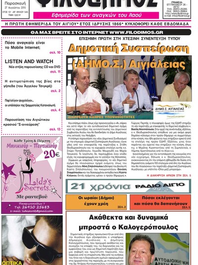Με αποκαλυπτικά ρεπορτάζ για τις εξελίξεις στο δημοτικό τοπίο της Αιγιάλειας κυκλοφορεί αύριο η εφημερίδα "Φιλόδημος". Ο νέος συνδυασμός υπό τον Στάθη Θεοδωρακόπουλο αλλά και οι κινήσεις του Δημήτρη Καλογερόπουλου είναι μόνον δύο από τα πολλά ρεπορτάζ της εφημερίδας. Δείτε παρακάτω το αυριανό πρωτοσέλιδο. Περισσότερα αύριο...