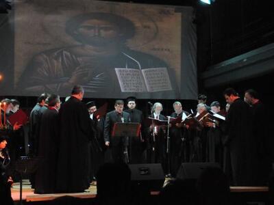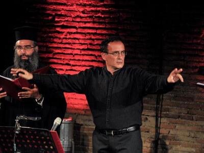 Στιγμιότυπο από την μουσική παράσταση τον Ιούλιο του 2012 στο Αρχαίο Ωδείο, με καλεσμένο μονωδό τον Μανώλη Μητσιά. Στη μέση διακρίνεται ο Πανασιολογιώτατος Αρχιμανδρίτης π. Ειρηναίος, ο χοράρχης Ανδρέας Τσιμάρας και μέλη της χορωδίας «Νυν και Αεί».