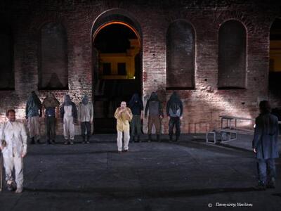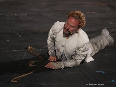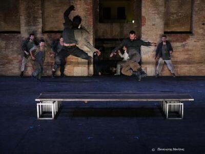 Από τα πρωτότυπα στοιχεία της παράστασης που επαναλαμβάνεται απόψε και την Τετάρτη 2 Ιουλίου 2014 στις 21.15, στο Αρχαίο Ωδείο, στο πλαίσιο του Διεθνούς Φεστιβάλ του Δήμου Πατρέων, ήταν αναμφίβολα η εμφάνιση στο ξεκίνημα του Αιμίλιου Χειλάκη και του Κωνσταντίνου Μαρκουλάκη πάνω στην ξύλινη τάβλα ισορροπίας που στηριζόταν σε μία μεταλλική βάση. Στην σκηνή υπήρχαν τρεις ακόμη αντίστοιχες κατασκευές όπου ισορρόπησαν έξι ηθοποιοί από τον χορό.