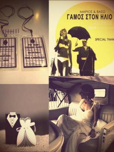 Στις φωτό λοιπόν που εξασφάλισε το thebest.gr, μπορείτε να δείτε τόσο τις μπομπονιέρες και το δώρο CD που προσφέρθηκε στους καλεσμένους από το εξώφυλλο της ταινίας «Κορίτσια στον Ήλιο» αλλά με τα πρόσωπα των γεμάτων χαρά νεόνυμφων, την λίστα με τα coctail, το αυτοκίνητο μάρκας ford, χρονολογίας 1929 με το οποίο έφτασε η νύφη στην εκκλησία, τις προσκλήσεις και τα gadget του γάμου.