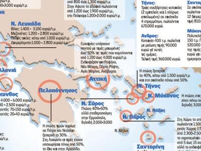 Κεφαλλονιά: Βίλες και μεζονέτες: 1.500 - 5.000 ευρώ/τ.μ. Διαμερίσματα: 900-2.500 ευρώ/τ.μ. Οικόπεδα εντός: 50-300 ευρώ/τ.μ. Οικόπεδα εκτός: 20-90/τ.μ.