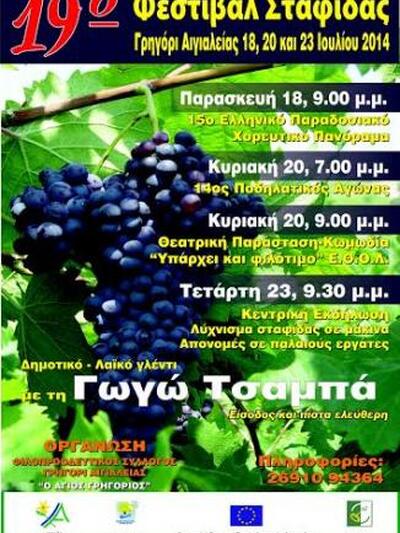 Το φετινό 19ο Φεστιβάλ Σταφίδας 2014, που διοργανώνει ο Σύλλογός Γρηγόρι, υπό την αιγίδα του Υπουργείου Αγροτικής Ανάπτυξης και Τροφίμων και σε συνδιοργάνωση με την Περιφέρεια Δυτικής Ελλάδος, περιλαμβάνει τις ακόλουθες εκδηλώσεις: