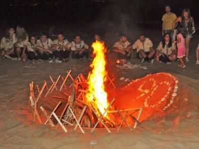 Αποκορύφωμα του τριημέρου κατασκήνωσης ήταν η μεγάλη επετειακή πυρά που άναψαν το βράδυ του Σαββάτου στην παραλία της Ελαίας, δίπλα στις εκβολές της Νέδας με παλιό καλό προσκοπικό τραγούδι, παιχνίδι και αυτοσχέδια θεατρικά.
