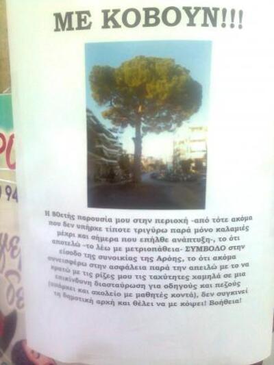 Μάλιστα αναρτήθηκε ανακοίνωση στην περιοχή, λίγο πιο πάνω από το σημείο που βρίσκεται η κουκουναριά. Το δέντρο, που απεικονίζεται στο χαρτί, ζητά βοήθεια, ώστε να μην το κόψουν.