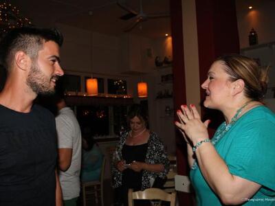 Μαζί τους και η Ελένη Κρίτα, ο Πρόδρομος Τοσουνίδης και ο Γιάννης Τσιμιτσέλης ο οποίος παρακολούθησε και την παράσταση και χειροκρότησε τους συναδέλφους και φίλους του στο Ρωμαικό Ωδείο. Πέρασαν όλοι καλά! Οι θαμώνες του μαγαζιού επίσης, φωτογραφήθηκαν με την Κάτια Δανδουλάκη και την Τζόυς Ευείδη οι οποίες γλυκιές και χαλαρές δεν αρνήθηκαν σε κανέναν. (Οι φωτογραφίες είναι του Παναγιώτη Μουλίνου)