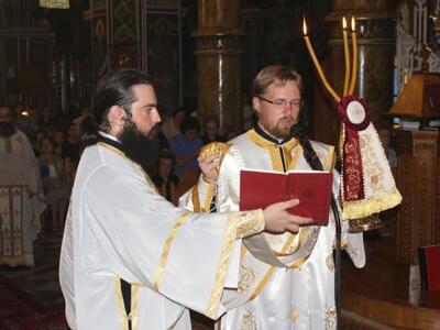 Στήν Θεία Λειτουργία συμμετεῖχε καί ὁ ἑλληνομαθής Ρώσος Διάκονος Ἀνατόλιος, Γραμματεύς τοῦ Τμήματος Ἐξωτερικῶν Ὑποθέσεων τοῦ Πατριαρχείου Μόσχας.