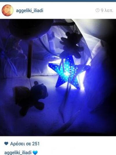 Αργά το βράδυ της Πέμπτης, η Αγγελική την ώρα που προφανώς ήταν έτοιμη να βάλει το μωράκι της για ύπνο, ανέβασε μία φωτογραφία της κούνιας του που φωτίζεται από ένα μπλε αστεράκι και υπάρχουν τριγύρω τα παιχνιδάκια του. Στην λεζάντα πόσταρε μια γαλάζια καρδιά.