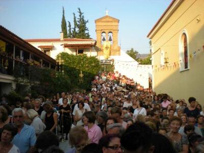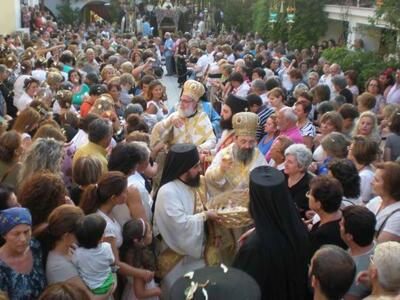 Ένα ποτάμι προσκυνητών ανέβηκε μέχρι τον καταπράσινο λόγο του Γηροκομειού για να προσκυνήσει το ιερό εικόνισμα της Παναγίας, στον προαύλιο χώρο του Μοναστηριού.