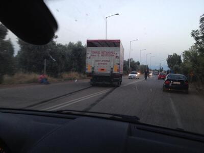 Στην άσφαλτο, μπροστά από το φορτηγό υπάρχει λίμνη αίματος, δείγμα ότι υπήρξε σοβαρός τραυματισμός.