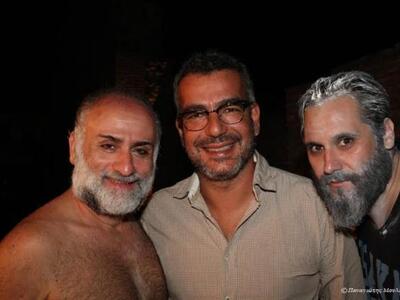 Ο Ανδρέας Α. Ανδριόπουλος συνομιλεί στα παρασκήνια με τον ηθοποιό του χορού των "Περσών", Γ. Ψυχογιό.