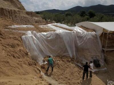 Εντατικά δουλεύουν στον λόφο Καστά στην Αμφίπολη τα μέλη της διεπιστημονικής ομάδας -υπό τη διεύθυνση της Κ.Περιστέρη- για την αποφυγή επιπτώσεων από τις καιρικές συνθήκες.