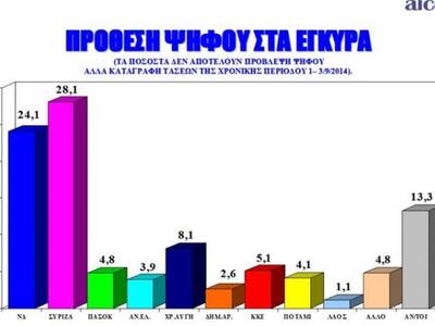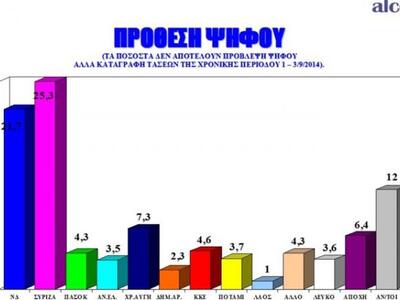 Δημοσκόπηση διενήργησε η Alco για την εφημερίδα «Το Ποντίκι». Σύμφωνα με τα ευρήματα της έρευνας, ο ΣΥΡΙΖΑ προηγείται κατά 3,6% στην Πρόθεση ψήφου και κατά 4% στην Αναγωγή της Πρόθεσης Ψήφου επί των εγκύρων.