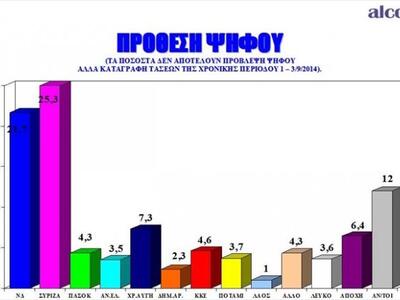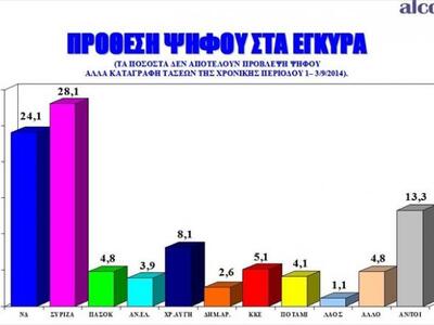 Με διαφορά 3,6% προηγείται ο ΣΥΡΙΖΑ της Ν.Δ. στην πρόθεση ψήφου σύμφωνα με δημοσκόπηση της εταιρείας ALCO που έγινε για λογαριασμό της εβδομαδιαίας εφημερίδας «Το Ποντίκι».