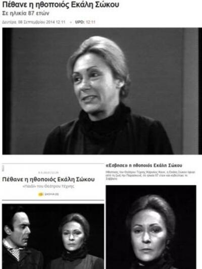 Το ότι η ηθοποιός Εκάλη Σώκου ασχολήθηκε σχεδόν αποκλειστικά και μόνο με το θέατρο (ήταν παιδί του σπουδαίου Θεάτρου Τέχνης του Κάρολου Κουν) είχε ως αποτέλεσμα να μη γίνει φίρμα, να μην υπάρχουν διαφημιστικές φωτογραφίες της online -πιθανότατα ούτε και οφλάιν, ούτε βιντεάκια της στο YouTube. Αυτό δε μειώνει την καριέρα της, μάλλον το αντίθετο. Όταν όμως πέθανε πλήρης ημερών (ήταν 87!) όσοι έγραψαν την είδηση μπήκαν στο ενδιαφέρον λήμμα γι' αυτήν στη Βικιπαίδεια και πρέπει να σοκαρίστηκαν που δεν υπήρχε φωτογραφία της. Τώρα; Google search φαντάζομαι, κι απ' τις σελίδες των αποτελεσμάτων, ο πρώτος που μετέδωσε την είδηση επέλεξε μία απ' τις τρεις εικόνες μιας εκ των γυναικών που εικονίζονταν στη σελίδα. Πλέον αυτές οι εικόνες, με τη λεζάντα "Εκάλη Σώκου", κυκλοφορούν σε πολλά σάιτ και τις εφημερίδες.