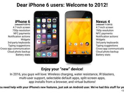 Για να πικάρουν μάλιστα το αντίπαλο δέος δεν δίστασαν να τους ειρωνευτούν με μια φωτογραφία που κάνει πάταγο στο διαδίκτυο και δείχνοντας τα δύο κινητά με τα χαρακτηριστικά τους αναφέρει: «Αγαπητοί χρήστες του iPhone6: Καλωσορίσατε στο 2012! Χαρείτε τη "νέα" συσκευή!».
