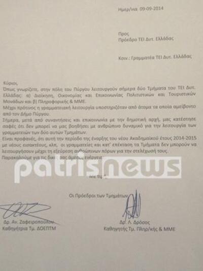 Το patrisnews.com φέρνει στο «φως» την επιστολή που συνέταξαν, συνυπέγραψαν και απέστειλαν οι πρόεδροι των δύο τμημάτων προς τον πρόεδρο του ΤΕΙ Δυτικής Ελλάδας, κ. Σωκράτη Καπλάνη, με την οποία του ζητούν να δώσει λύση στο θέμα της γραμματείας.
