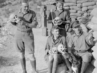 Αξιωματικοί του βρετανικού στρατού ποζάρουν το 1916 με ελληνικά κρανία που ανακαλύφθηκαν κατά τη διάρκεια της κατασκευής τάφρων στην αρχαία Ελληνική περιοχή της Αμφίπολης