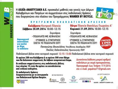 Η Αχαϊα Αναπτυξιακή Α.Ε. προσκαλεί γονείς και μαθητές των Δήμων Καλαβρύτων και Πατρέων να δώσoυν το "παρών" στις ποδηλατικές δράσεις που διοργανώνει στο πλαίσιο του προγράμματος wander by bicycle.