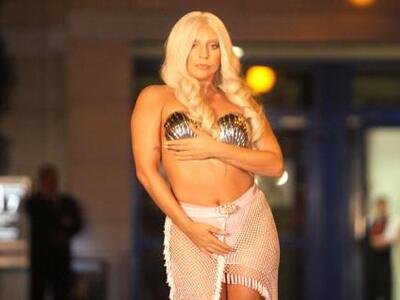 Με μια άκρως αποκαλυπτική εμφάνιση, φορώντας διχτυωτό παρεό και δύο μεταλλικά κοχύλια να κρύβουν το μπούστο της, βγήκε από τις πύλες του αεροδρομίου, όπου την περίμεναν εκατοντάδες θαυμαστές της να την αποθεώσουν.