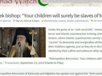 Στο άρθρο που έχει τίτλο "Έλληνας επίσκοπος: Τα παιδιά σας θα είναι σκλάβοι των μουσουλμάνων", παρατίθενται οι δηλώσεις που είχε κάνει ο Μητροπολίτης Αμβρόσιος κατά του αντιρατσιστικού: