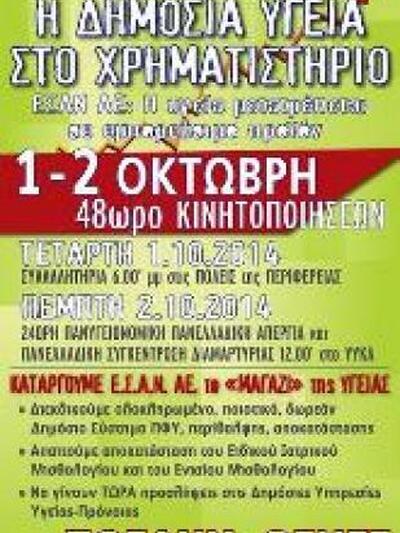 Την 1/10/2014 οι ομοσπονδίες της Υγείας, τα υγειονομικά σωματεία Νοσοκομείων- ΙΚΑ- ΕΟΠΥΥ- ΠΕΔΥ- ΚΨΥ, φορείς, σύλλογοι πασχόντων, υγειονομικοί φοιτητές και ΝΤ ΑΔΕΔΥ, συνδιοργανώνουν συλλαλητήριο για την Υγεία.