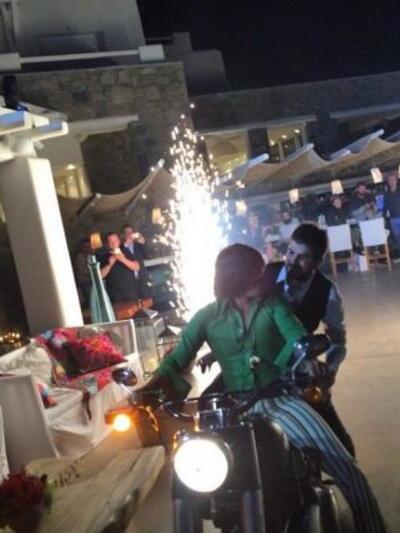 Μετά τη τελετή ακολούθησε γαμήλια δεξίωση αλλά το ζευγάρι δεν έφτασε μαζί στο χώρο. Ο Γιώργος Ανδρίτσος έφτασε με μια μηχανή που οδηγούσε ο Τόνι Σφήνος και που σήμανε την έναρξη του πάρτι.