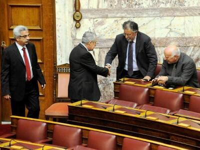 Ο πρόεδρος της ΔΗΜΑΡ Φώτης Κουβέλης είχε χειραψία με τον βουλευτή του κόμματος Γιάννη Πανούση, κατά τη διάρκεια του Αγιασμού για την έναρξη της νέας Κοινοβουλευτικής Περιόδου, στη Βουλή.