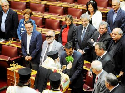 Την ευλογία του Αρχιεπισκόπου Ιερώνυμου δέχτηκε ο πρόεδρος του ΣΥΡΙΖΑ, Αλέξης Τσίπρας, στη Βουλή υπό το βλέμμα του αρχηγού των ΑΝΕΛ, Πάνου Καμμένου και του προέδρου του ΠΑΣΟΚ, Ευάγγελου Βενιζέλου.