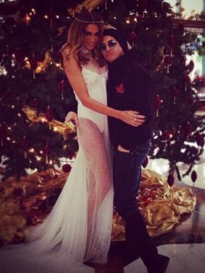 Η τραγουδίστρια, που είναι ντυμένη άγγελος, ποζάρει αγκαλιά με έναν φίλο της και του εύχεται «Καλά Χριστούγεννα» για να πάρει από τον ίδιο την απάντηση «Χριστός Ανέστη!».