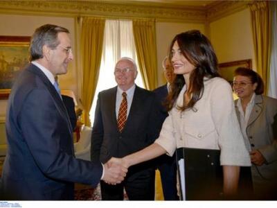 Νωρίτερα, η Αμάλ Αλαμουντίν-Κλούνι μαζί με την ομάδα των διακεκριμένων Βρετανών νομικών συναντήθηκε με τον Πρωθυπουργό Αντώνη Σαμαρά στο Μέγαρο Μαξίμου.