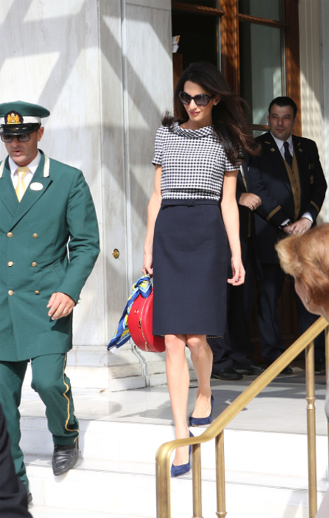 Στην αρχή ήταν το καφέ παντελόνι με το κροπ τοπ και το κοντό λευκό σακάκι, μετά το κρεμ φόρεμα με τις λαδί λεπτομέρειες, χθες το λευκό μπουκλέ τύπου Chanel ταγέρ της και σήμερα, κατά την αποχώρησή της το μπλε φόρεμα. Οποιο σύνολο από αυτά που φόρεσε η Αμάλ Αλαμουντίν στην Αθήνα φέρει κανείς στο νου του άνετα θα μπορούσε να τα «φορέσει» και στην Τζάκι Κένεντι.