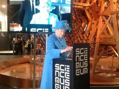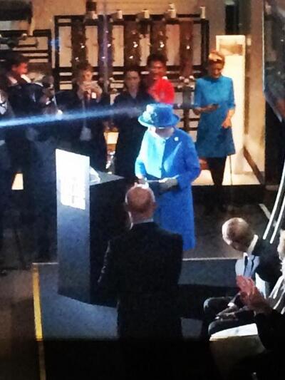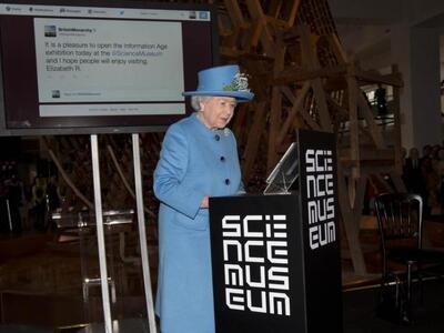 H βασίλισσα της Αγγλίας στάθηκε μπροστά από ένα τάμπλετ στο μουσείο και μπροστά σε περίπου 600 επισκέπτες, αφού έβγαλε ένα από τα λευκά της γάντια για να μπορέσει να αγγίξει την οθόνη, έγραψε: «Είναι χαρά μου να εγκαινιάζω την έκθεση Information Age στο Μουσείο Επιστήμης (@ScienceMuseum) κι ελπίζω να χαρείτε την επίσκεψή σας. Ελισάβετ».