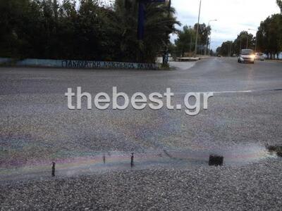 Το πετρέλαιο έχει αναμιχθεί με το βρόχινο νερό και έχει καλύψει όλο το πλάτος του δρόμου.