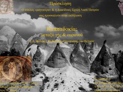 Την Τετάρτη 5 Νοεμβρίου 2014 και ώρα 7:00 μ.μ. οργανώνεται από τον κύκλο «μαγναύρα» για τον ευρύτερο ελληνικό πολιτισμό & την Διακίδειο Σχολή Λαού Πατρών εκδήλωση με θέμα "Καππαδοκία: μεταξύ γής και ουρανού" στην αίθουσα της Διακιδείου Σχολής Λαού Πατρών, Κανάρη 58, Πάτρα.