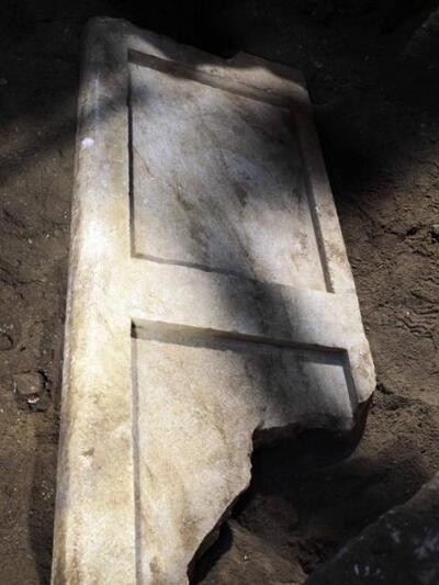 3. Κατά την αποχωμάτωση του τέταρτου χώρου διαπιστώθηκε η ύπαρξη τεχνητού ορύγματος επί του φυσικού σχιστολιθικού εδάφους, επιφάνειας, 4Χ2,10μ., το οποίο είναι επιχωμένο με ιλυώδη άμμο (όπως αλλωστε και η υπόλοιπη επίχωση του μνημείου). Ήδη έχει προχωρήσει η ανασκαφή, σε βάθος περίπου 1,40μ. από την επιφάνεια του κατωφλίου και η επίχωση συνεχίζεται. Κατά την απομάκρυνση της αμμώδους επίχωσης εντοπίστηκε το δεύτερο μαρμάρινο θυρόφυλλο σε καλή κατάσταση διατήρησης, πεσμένο μέσα στο όρυγμα, διαστάσεων, 2Χ0,90Χ0,15μ. και βάρους περίπου έναμισυ τόνο. Φωτο 1,2).Σήμερα επιχειρείται η απομάκρυνσή του από το σημείο εύρεσης.. Πριν από τη συνέχιση της απομάκρυνσης των χωμάτων του ορύγματος, θα γίνουν εργασίες εγκιβωτισμού και αντιστήριξης των κατακόρυφων παρειών του (αλλά και της επίχωσης κάτω από το θεμέλιο των πλαϊνών τοίχων), ώστε να διασφαλισθεί η ευστάθεια της θεμελίωσης των πλαϊνών τοίχων.