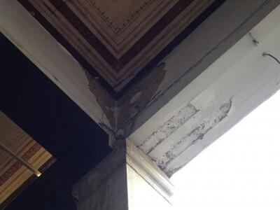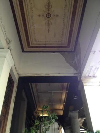 Στους θόλους πάνω από πεζοδρόμια αλλά και στα αετώματα παλαιών κτηρίων στέκουν κομμάτια επικίνδυνα να αποκολληθούν με έναν σεισμό ή μια νεροποντή που θα προκαλέσει διάβρωση.