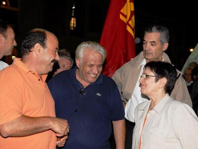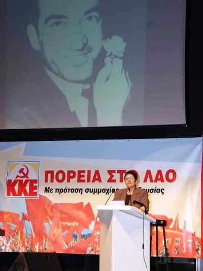 Μιλώντας σε εργαζόμενους της ΕΛΠΑΚ στην Πάτρα, το 2003. Δίπλα της ο αείμνηστος βουελυτής του ΚΚΕ Παναγιώτης Κοσίωνης