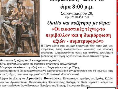 Ομιλήτρια θα είναι η Χρυσάνθη Βανταράκη, Εικαστικός, καθηγήτρια Καλλιτεχνικών μαθημάτων στην Δευτεροβάθμια Εκπαίδευση και Πρόεδρος της Ένωσης Εικαστικών Πάτρας.