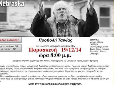 Την Παρασκευή 19/12/14, ώρα 8:00 μ.μ θα πραγματοποιηθεί προβολή της ασπρόμαυρης Αμερικανικής ταινίας «Nebraska» που πέρυσι διεκδίκησε 6 βραβεία Όσκαρ.