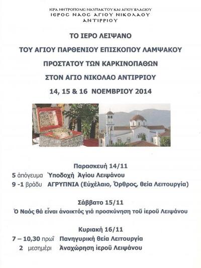 Προς ιερό προσκύνημα εκτίθεται από αύριο Παρασκευή το ιερό λείψανο του Αγίου Παρθενίου, Επισκόπου Λαμψάκου, στον Ιερό Ναό Αγίου Νικολάου, στο Αντίρριο.