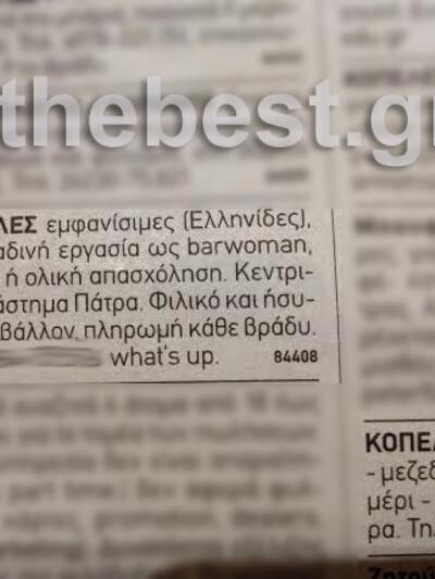 Διαβάζοντας μικρές αγγελίες το πρώτο που διαπιστώνει κανείς είναι ότι βασικό ζητούμενο εν έτει 2014 για να βρεις δουλειά και στην Πάτρα είναι η καλή εμφάνιση και η νεαρή ηλικία. Κι αυτό γιατί οι περισσότερες αγγελίες αφορούν σε σερβιτόρες ή μπαργούμεν. Και είναι εν μέρει λογικό αν σκεφτεί κανείς ότι οι επιχειρήσεις που ανθούν εν καιρώ κρίσης στην Πάτρα είναι τα καφέ, μπαρ, εστιατόρια, τσιπουράδικα κ.α.