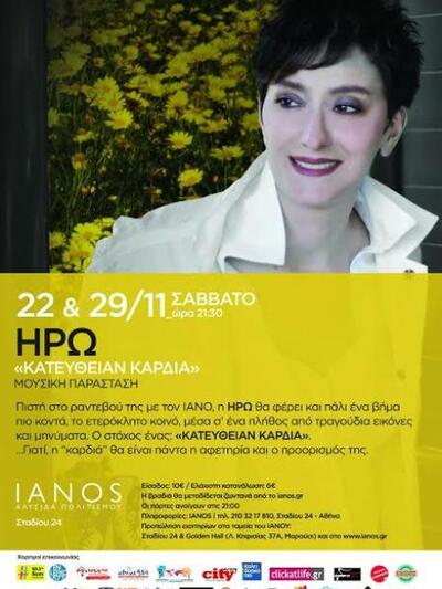Για τέταρτη χρονιά, η Ηρώ εμφανίζεται στον ΙΑΝΟ, στον ιδιαίτερο χώρο του βιβλιοπωλείου, που έχει μοιραστεί πολλά και ποικίλα συναισθήματα και ήχους με τον κόσμο. Πιστή σ´ αυτό το άτυπο ραντεβού, φέρνει πάντα ένα βήμα πιο κοντά, το ετερόκλητο κοινό, μέσα σ' ένα πλήθος από τραγούδια εικόνες και μηνύματα. Σ’ ένα ξεχωριστό πρόγραμμα μας συστήνει μια διαφορετική πλευρά της, καταθέτοντας την δική της προσέγγιση στους διαχρονικούς συνθέτες του ελληνικού τραγουδιού (Ξαρχάκος, Χατζιδάκις, Γιάννης Σπανός, Άκης Πάνου, Σταμάτης Κραουνάκης) αλλά και ερμηνείες σε τραγούδια-έκπληξη από το διεθνές ρεπερτόριο.