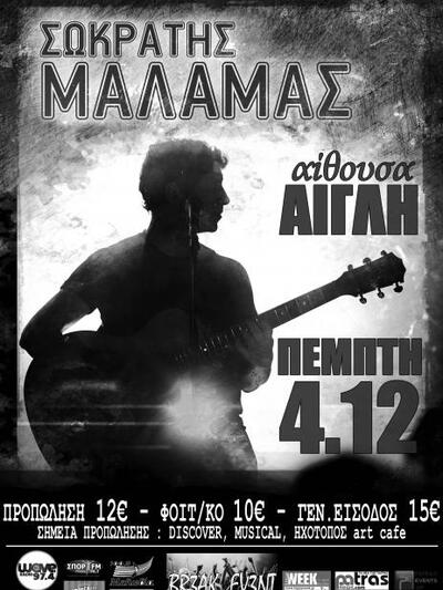 «Στα είπα όλα», «Πριγκηπέσα», «Τσιγάρο ατέλειωτο», «Έχω 40 πυρετό», «Θα βάλω τα μεταξωτά» και άλλα αγαπημένα κομμάτια αναμένεται να παρουσιάσει ο Βορειοελλαδίτης ερμηνευτής, τραγουδοποιός και κιθαρίστας Σωκράτης Μάλαμας, ο οποίος θα έρθει στην Πάτρα για ένα μοναδικό μουσικό live την ερχόμενη Πέμπτη 4 Δεκεμβρίου 2014, στην αίθουσα Αίγλη στον πολυχώρο της Βέσο Μάρε.