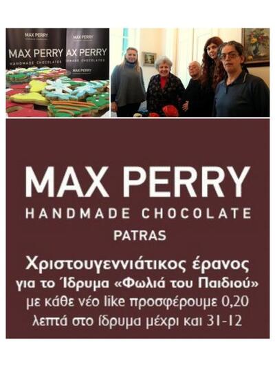 Με ιδιαίτερη ευαισθησία τα MAX PERRY HANDMADE CHOCOLATES στην Πάτρα - μία ελληνική εταιρεία παραγωγής και διάθεσης σοκολάτας, η οποία μετρά περισσότερα από 2 χρόνια επιτυχημένης παρουσίας στο χώρο της ζαχαροπλαστικής στην Πάτρα - γιορτάζει τα Χριστούγεννα και δείχνει έμπρακτα την αγάπη τους για το συνάνθρωπο μας και ιδιαίτερα τα ορφανά παιδάκια μέσω της εορταστικής καμπάνιας που πραγματοποιεί στη σελίδα της στο facebook, για την ενίσχυση των ορφανών και άπορων παιδιών.