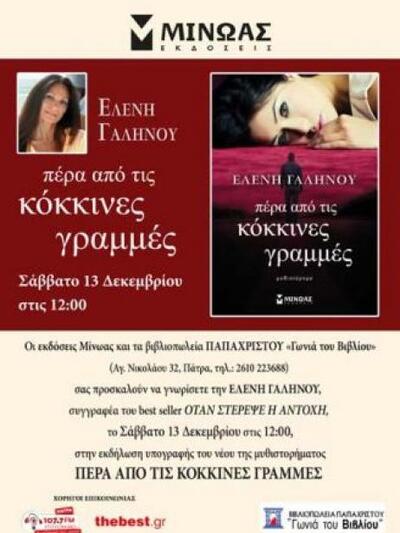 Η κυρία Γαληνού θα μιλήσει για το νέο της μυθιστόρημα "Πέρα από τις κόκκινες γραμμές" και θα συναντήσει τους αναγνώστες της στην "Γωνιά του Βιβλίου" στις 13/12